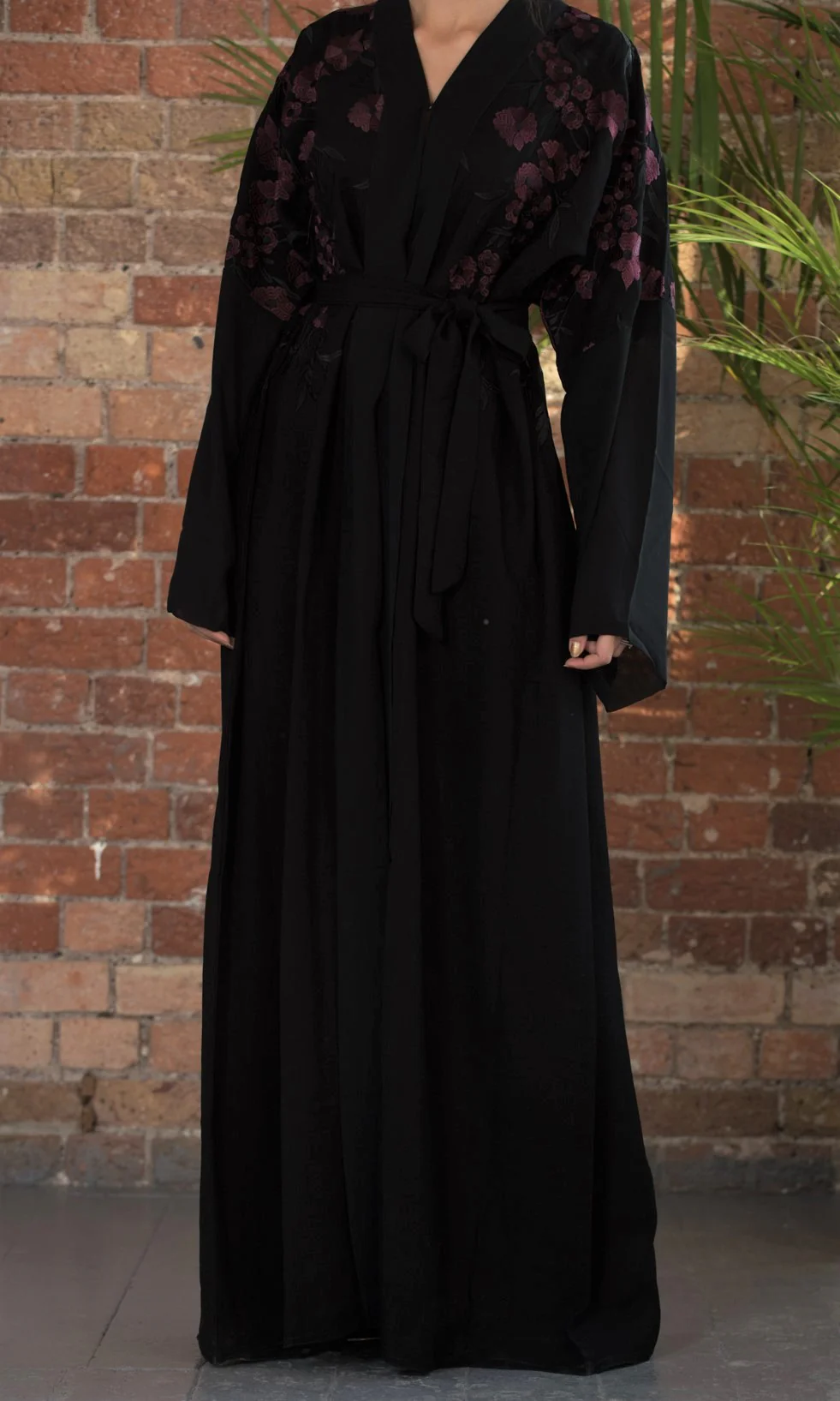 A classic black abaya with contrasting burgundy floral embroidery. A versatile piece which can be dressed down for casual wear or accessorized and instantly glammed up for an evening out.