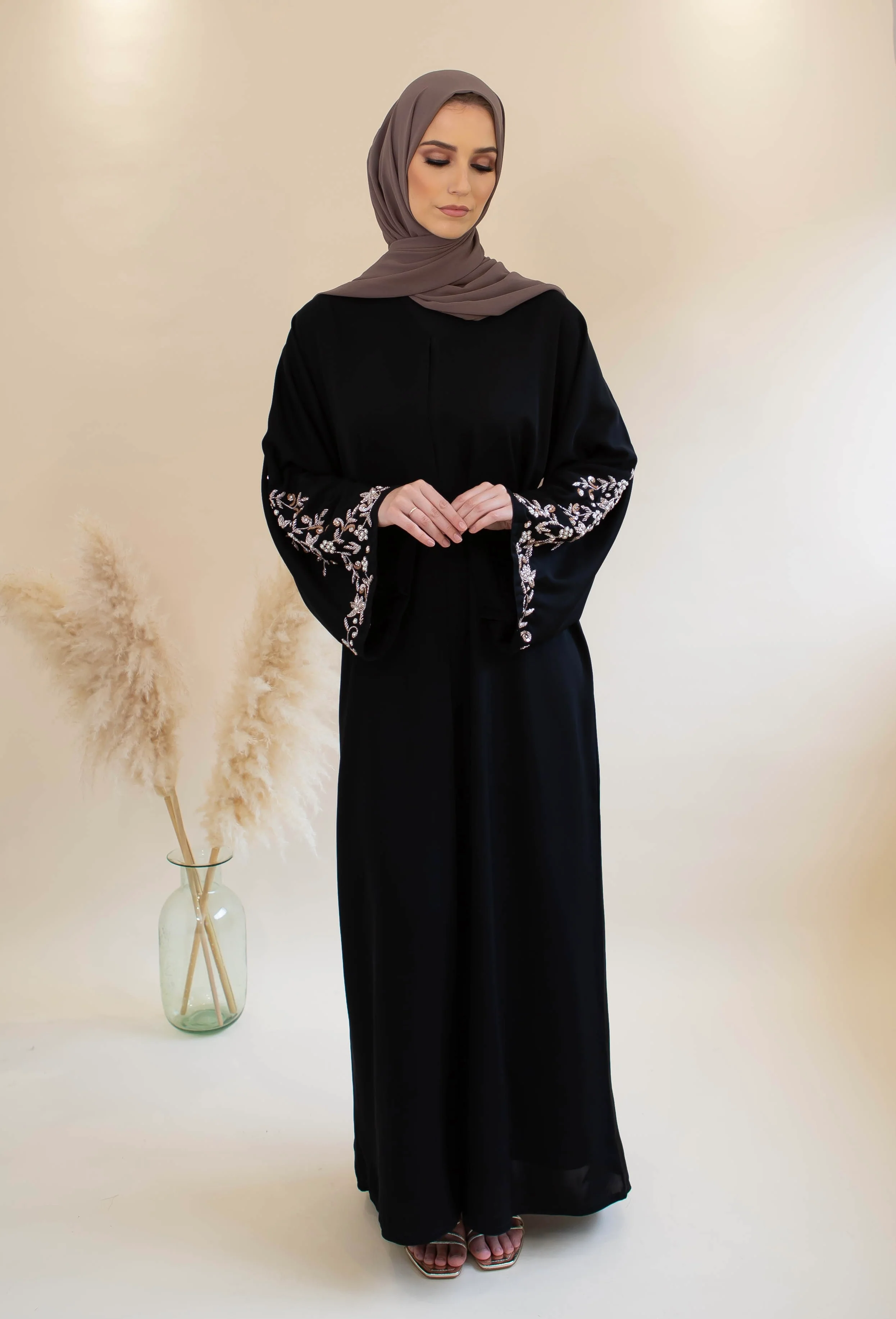 A classic black abaya with stunning embellished sleeves! The perfect cover up to instantly glam your outfit.