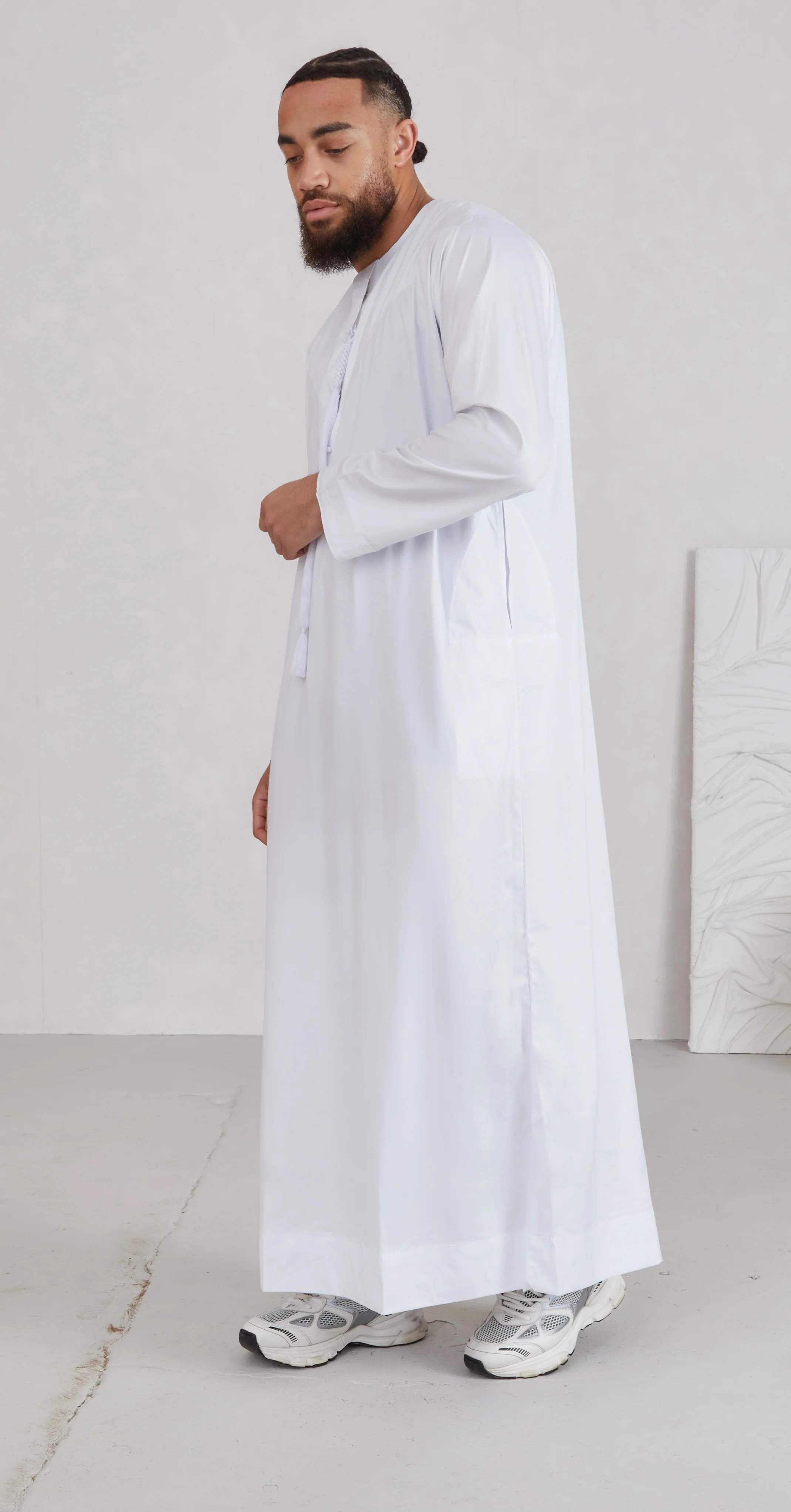 Upgrade your wardrobe with our premium quality Emirati thobe which has a silk like finish, giving it an overall luxury look and feel. Ideal for all occasions.