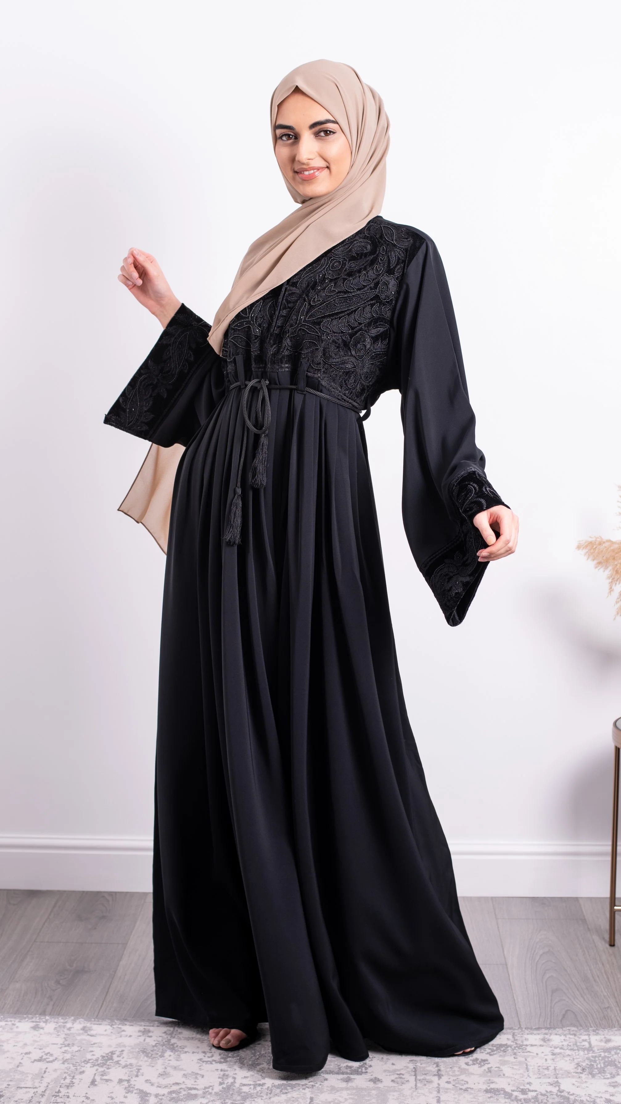 The perfect occasionwear abaya! A stunning closed abaya with a velvet upper bodice which features beautiful bead work and pretty emboss detail. The upper bodice is made up of buttons to the waist. Waist downwards the abaya is closed with pleat detailing which adds to the flare of the abaya making it extra luxurious!