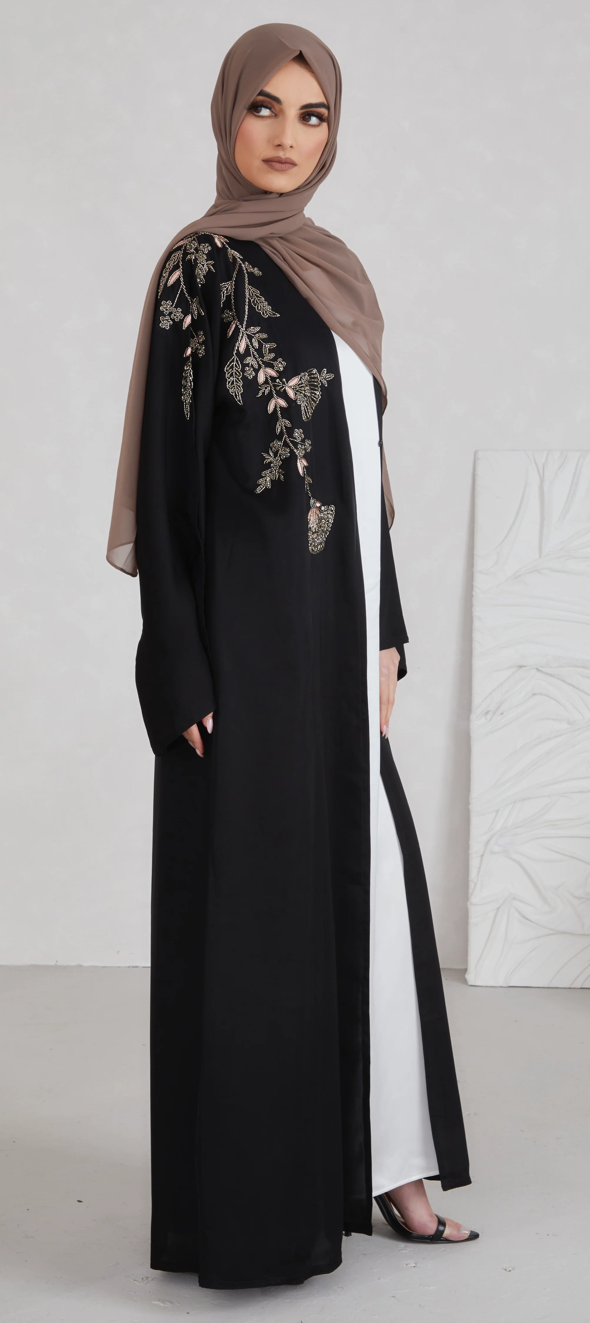 A classic black open abaya with pink and gold floral design bead embellishments. Perfect for special occasions. The product consists of the abaya and a matching belt. The abaya has been styled with our Satin Sleeveless Slip Dress in White and the Coffee Chiffon Hijab.