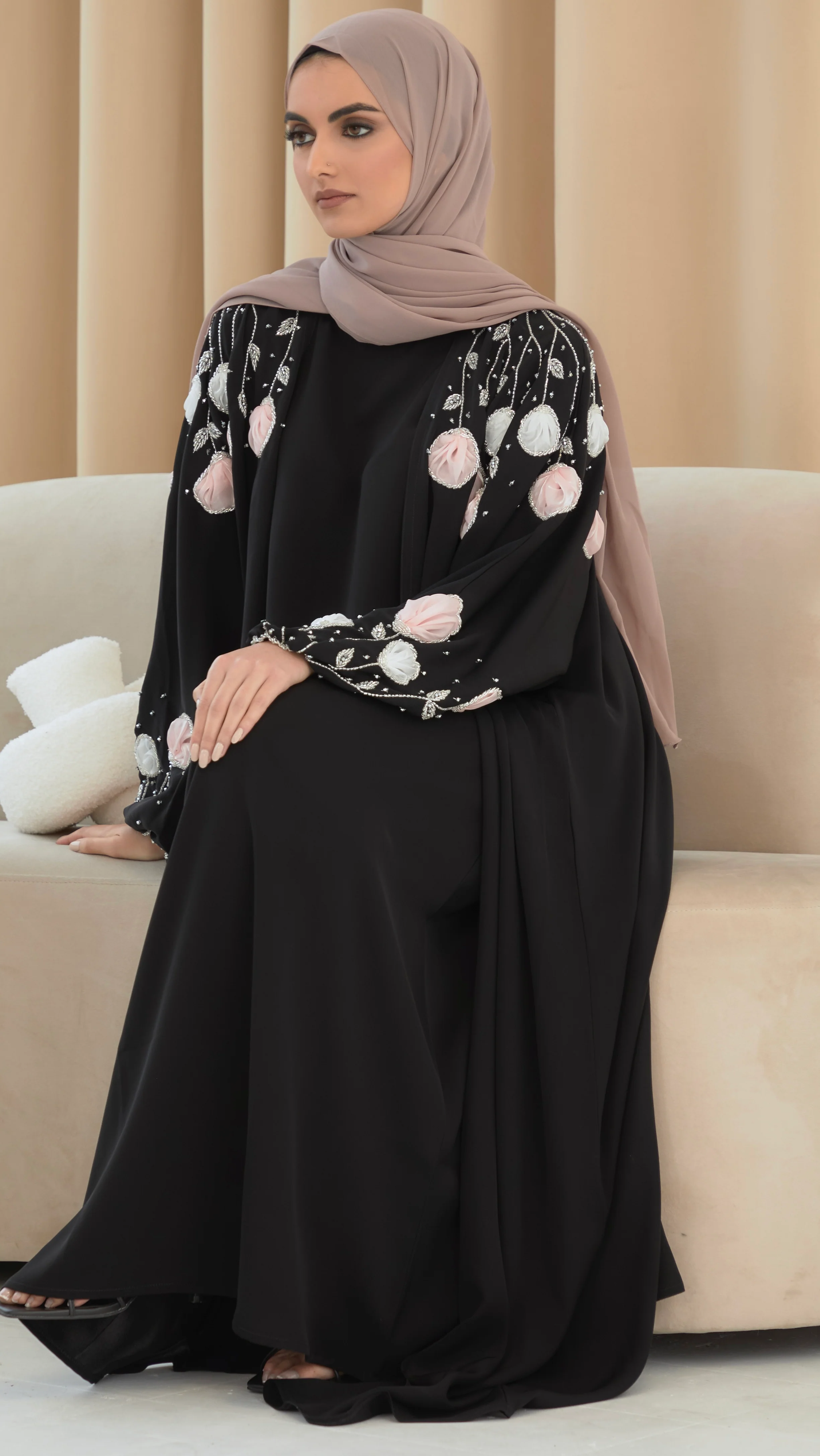 An elegant two piece occasion wear set. A classic black abaya with pretty floral embellishments, coming complete with an inner slip dress.
